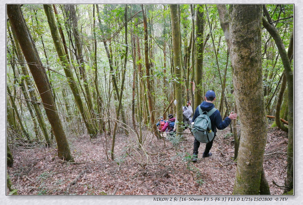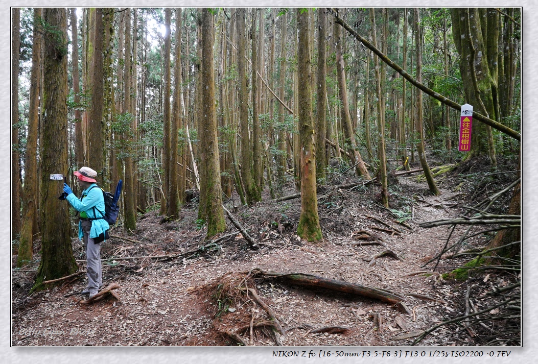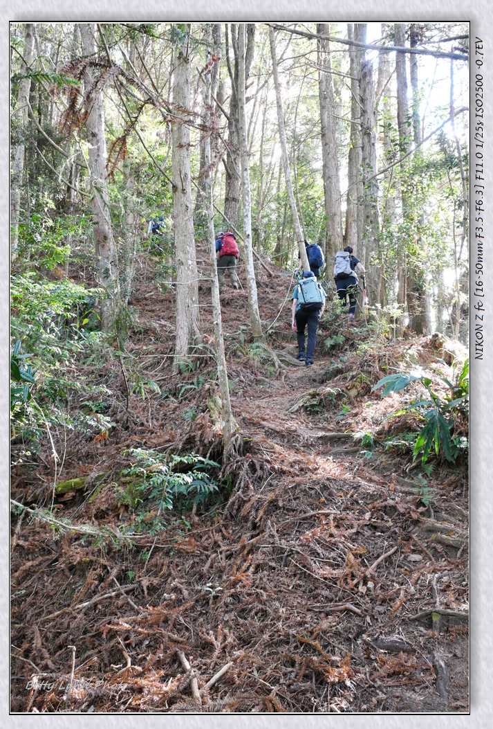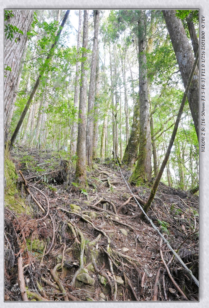 從竹林轉戰杉樹林, 輔助繩依舊如影隨形, 真是一路陡到頭…