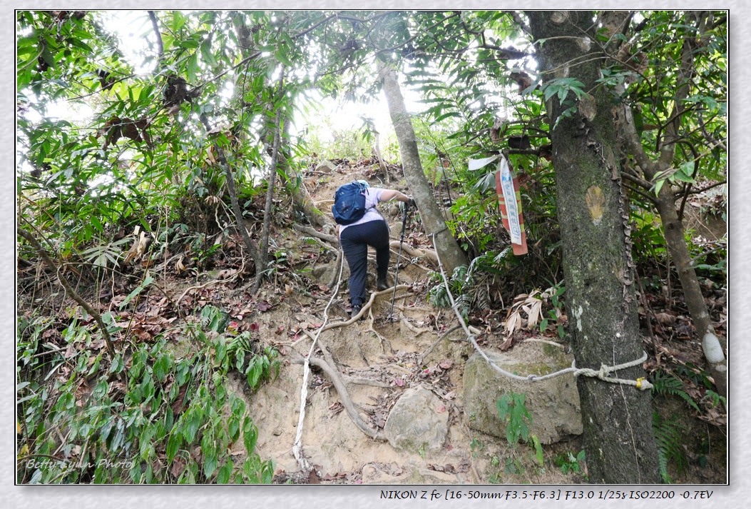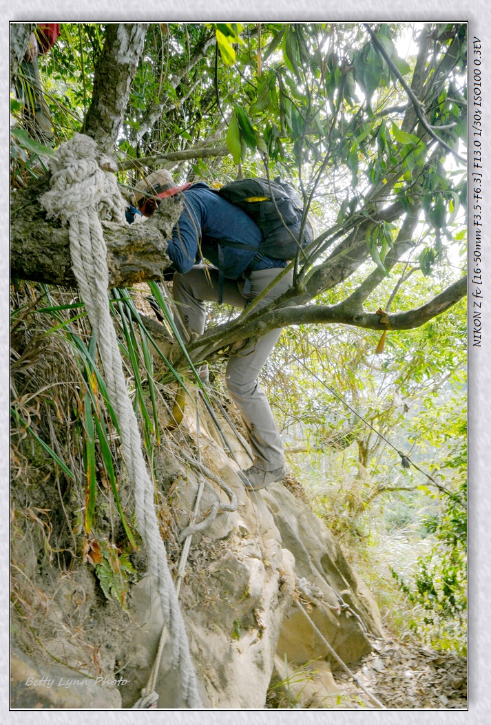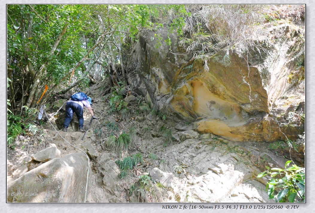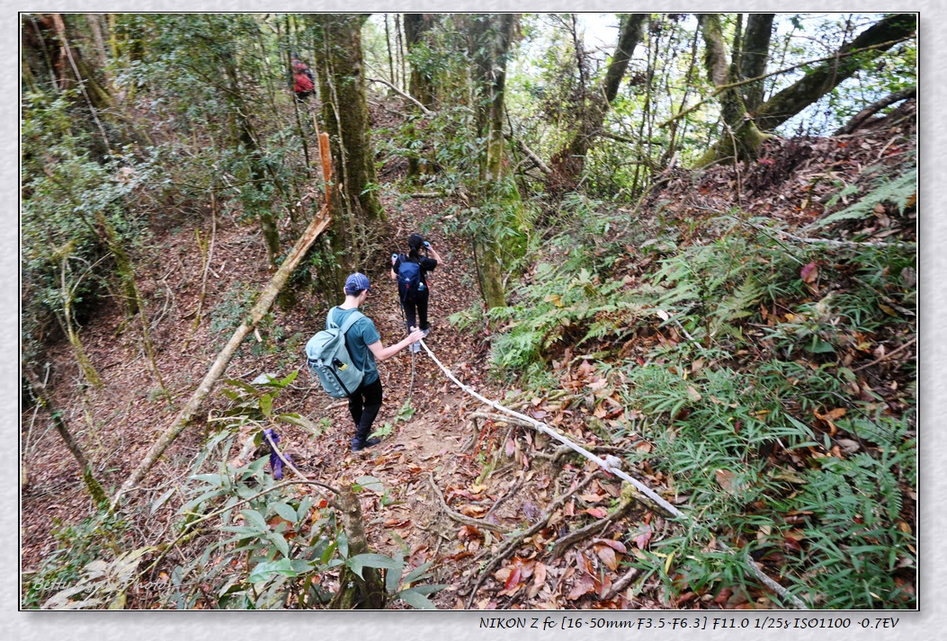 這會兒進到竹林… 看到又是綁了輔助繩的陡坡, 嘆氣的當下覺得還真是不出意料啊~~