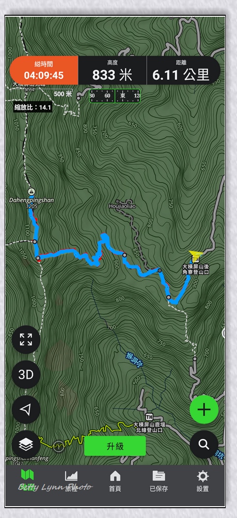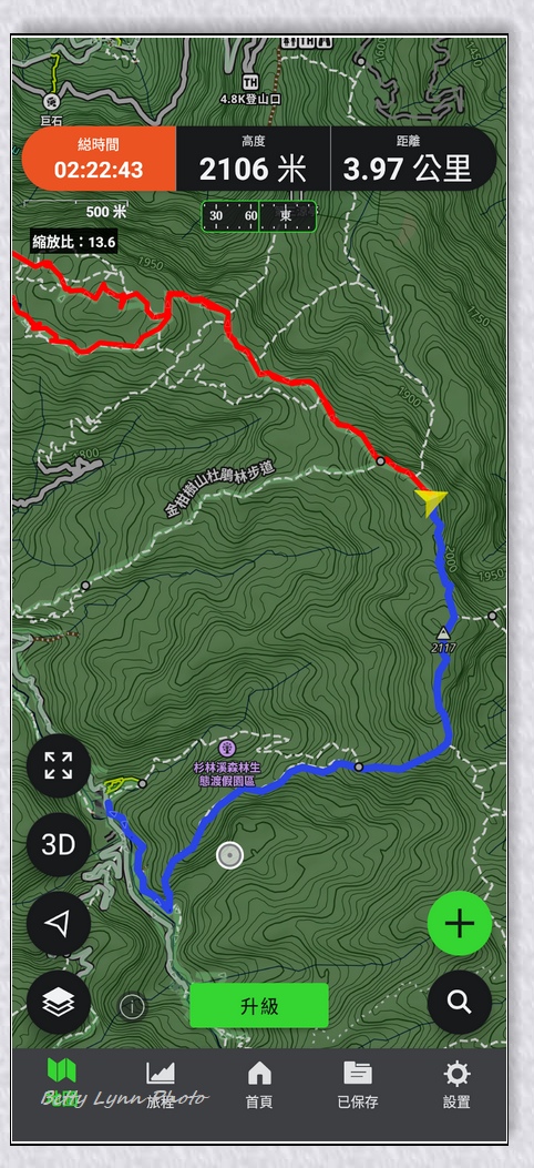 這張路程圖是我在攻頂時截的圖, 紅色是傳統建議路線, 藍色是我們上午走的路線, 原本打算走的藥卉步道不給過之後, 我們往下改道牛亭步道上山…