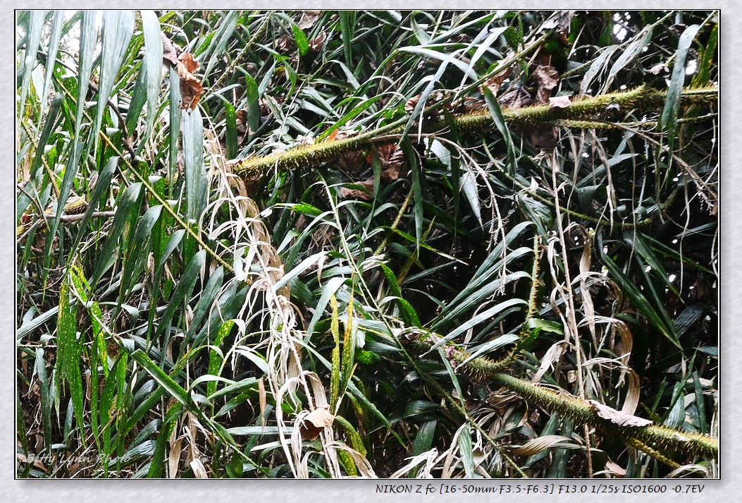 幫照片裁切放大(沒辦法貼近拍, 太恐怖), 這樣可以稍微看清楚黃藤的長相… 比狼牙棒還嚇人, 那些左一條又一條的細藤上面也都有刺, 所以真的是只能繞著走