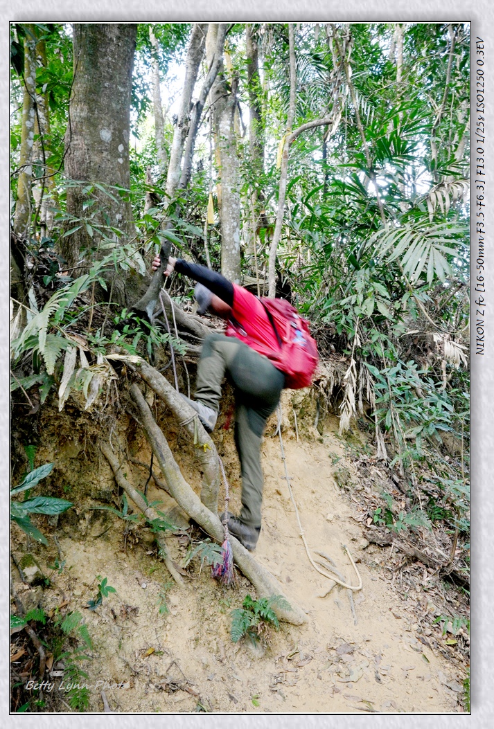 除了隨時冒出來要戳人的黃藤, 三不五時也會出現這種類攀登的拉繩路段