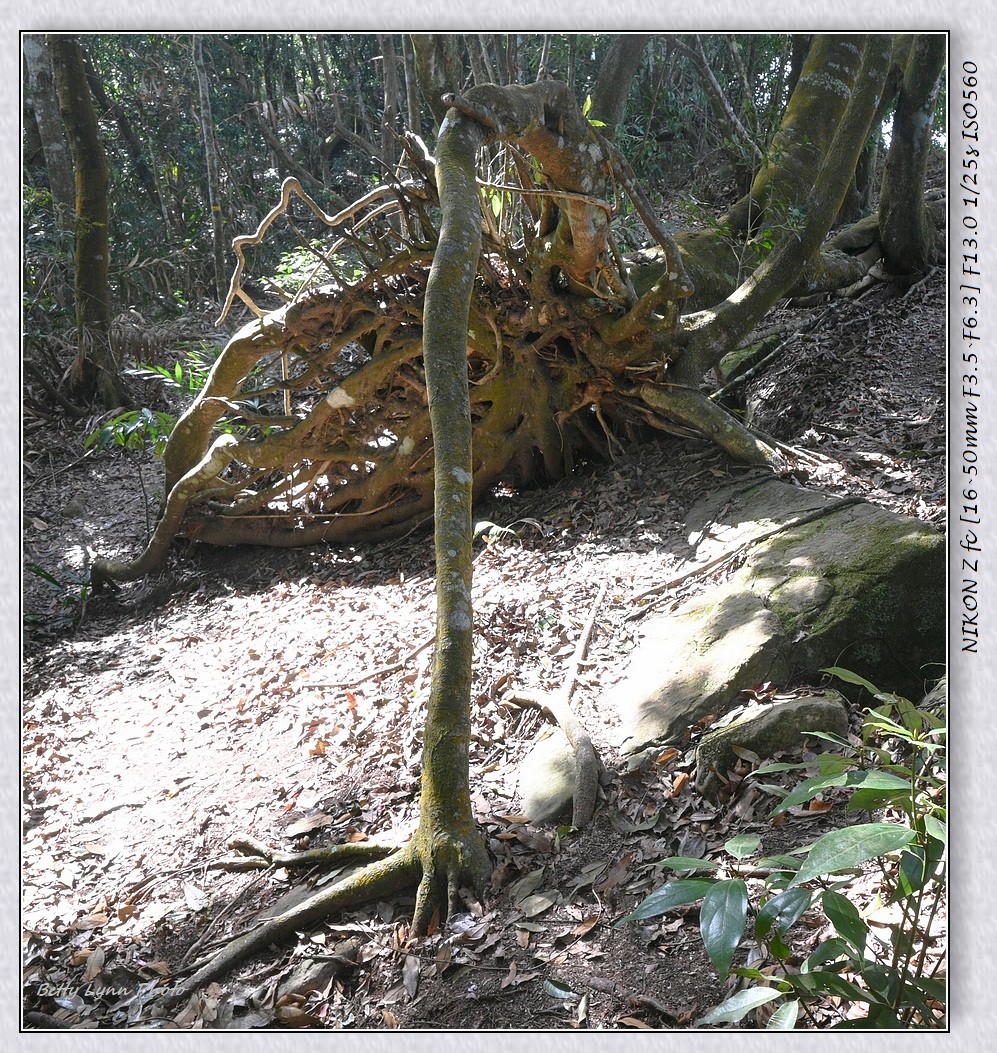 從稜線旁有一棵非常帥的倒木, 整個根部都翻出來, 但奇特的是有一條根想辦法抓住了土地, 結果靠這條根… 倒木又繼續活了…