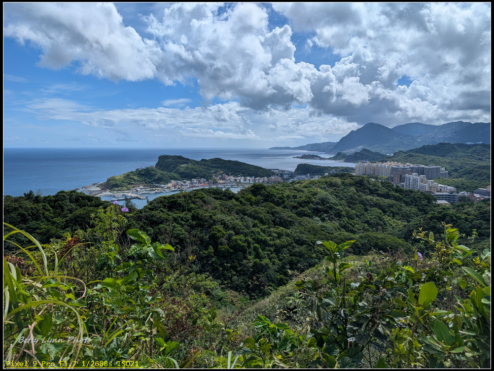 山徑爬到一半有個展望點… 這裡視野超讚, 比槓子寮山上面的三角點還廣, 左邊從基隆港往右一直看到八斗子, 正前下方連接和平島的社寮橋也是超清楚