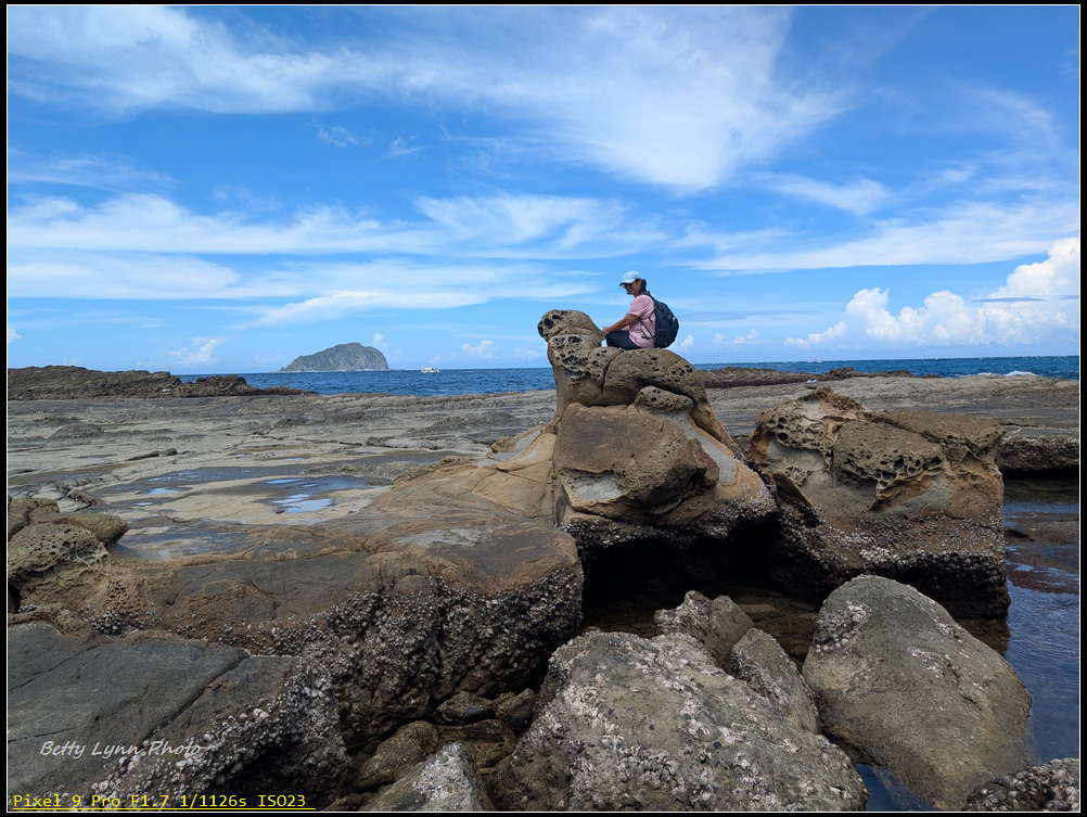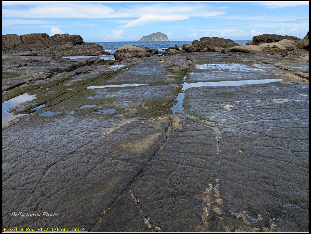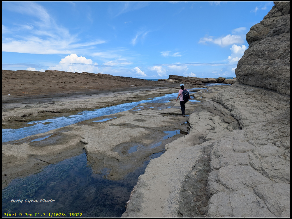 因為查到退潮低點是下午1點, 只好透中島跑來海邊, 果然水退光光… 朋友來過一次, 熟門熟路地繞過岬角直奔目的地