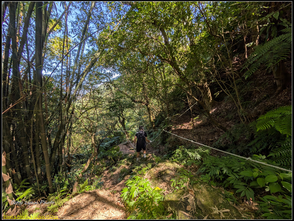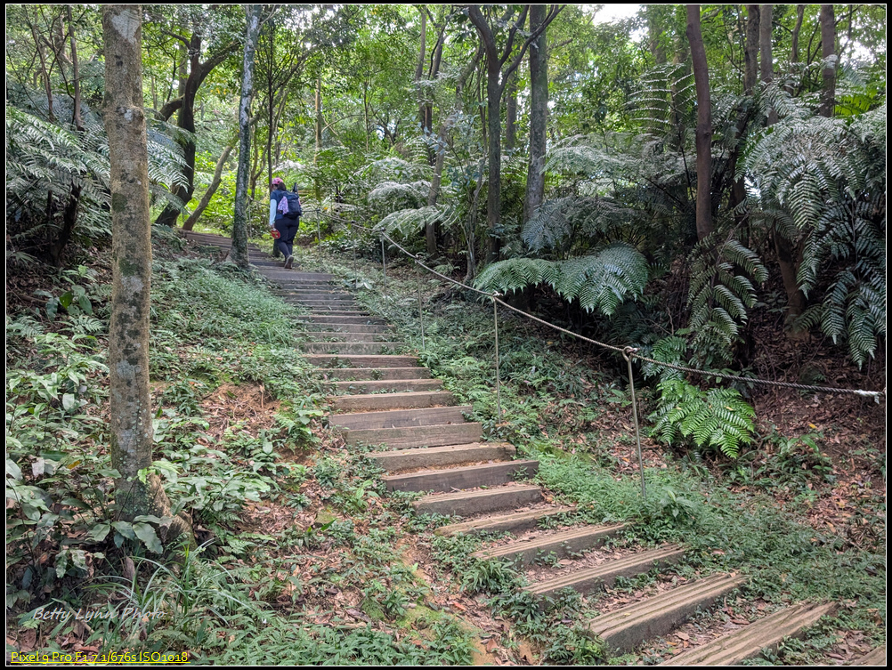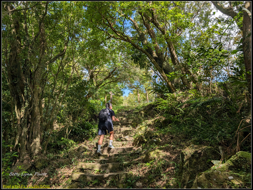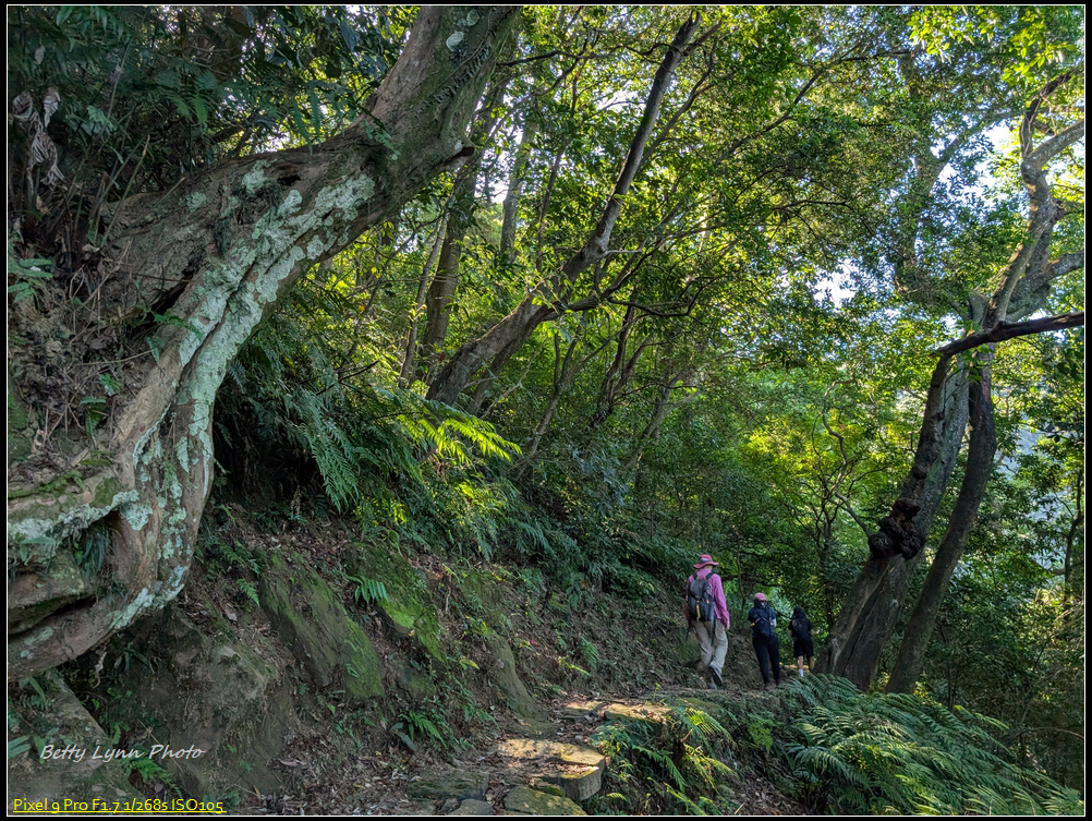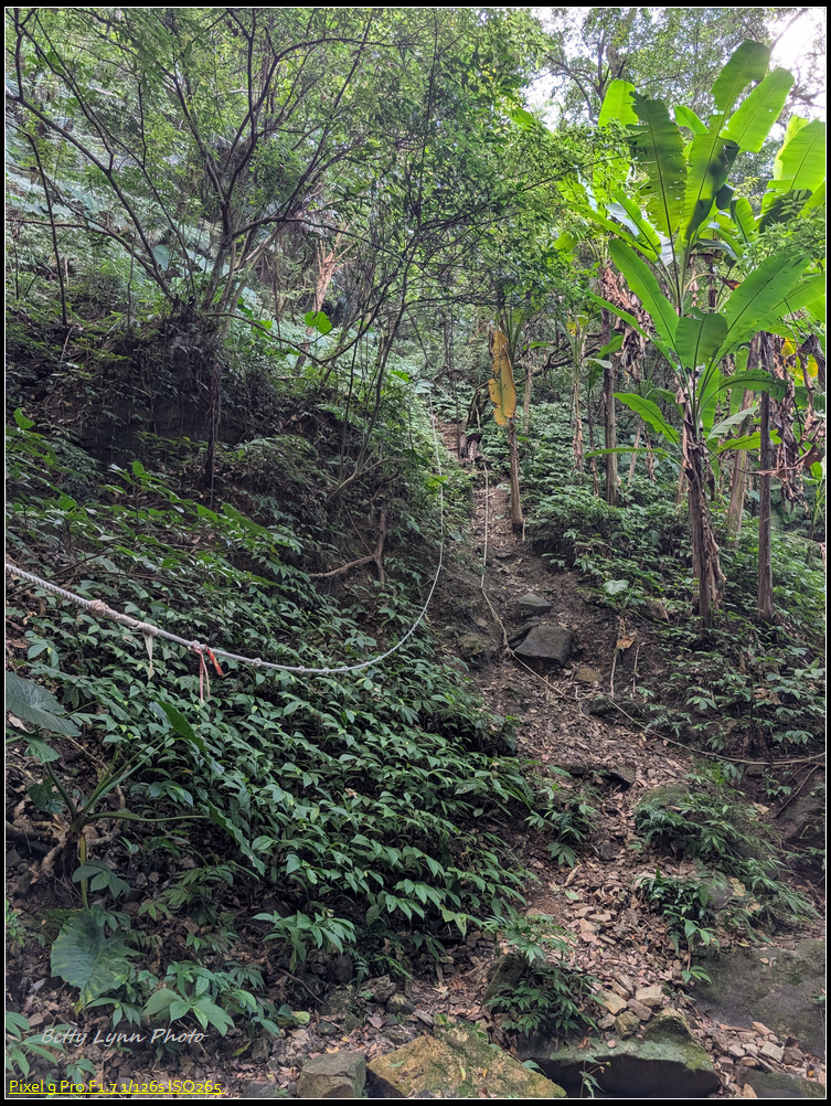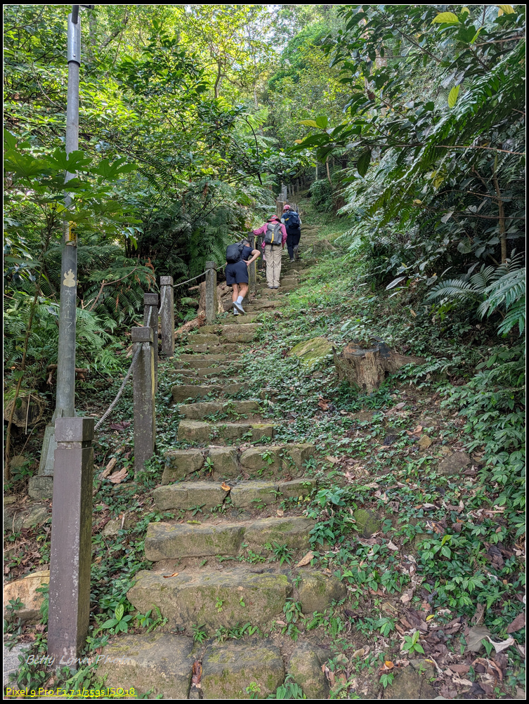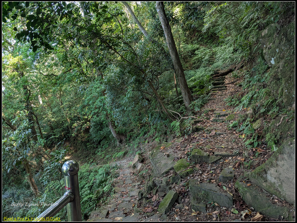 在土地公這邊變成陡峭的舊石階路, 上面滿滿青苔, 一看就很滑, 感謝好幾天沒下雨, 所以打滑的程度降低很多, 而且有的路段架設繩索, 算是幫上不少忙, 就是架繩常卡在路中間, 所以拉繩時要左右橋來喬去…