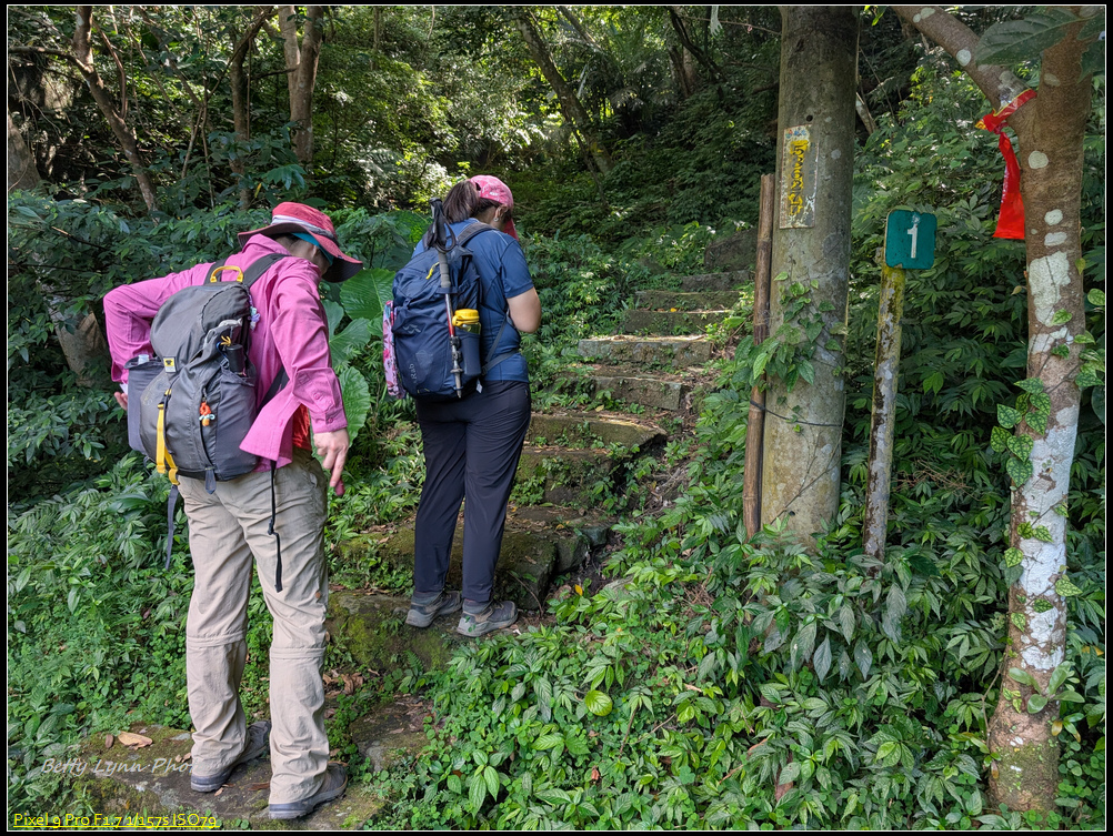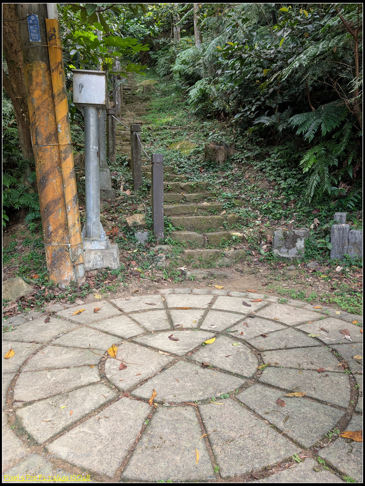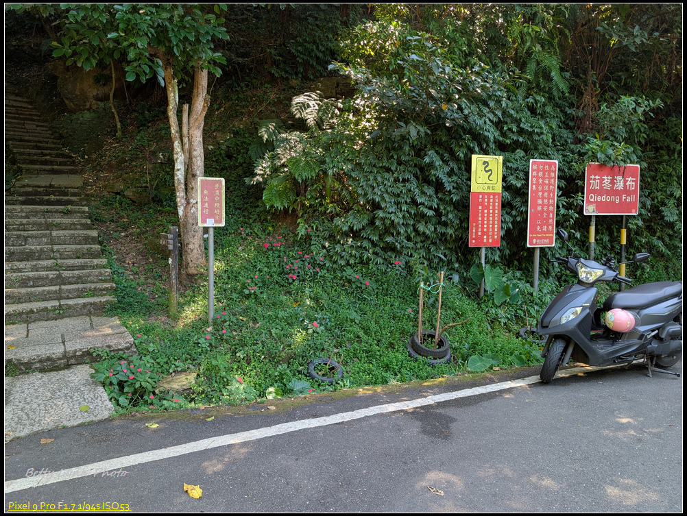 回到馬路繼續踢, 大尖山瀑布的入口就在不遠處, 但這邊沒有任何路標, 就只有登山隊綁在樹上的綁帶 & 藏在山壁間的一號牌子… 不過注意找一下石頭階梯, 還是可以很容易發現