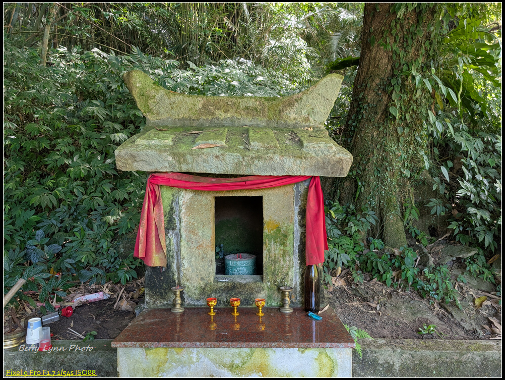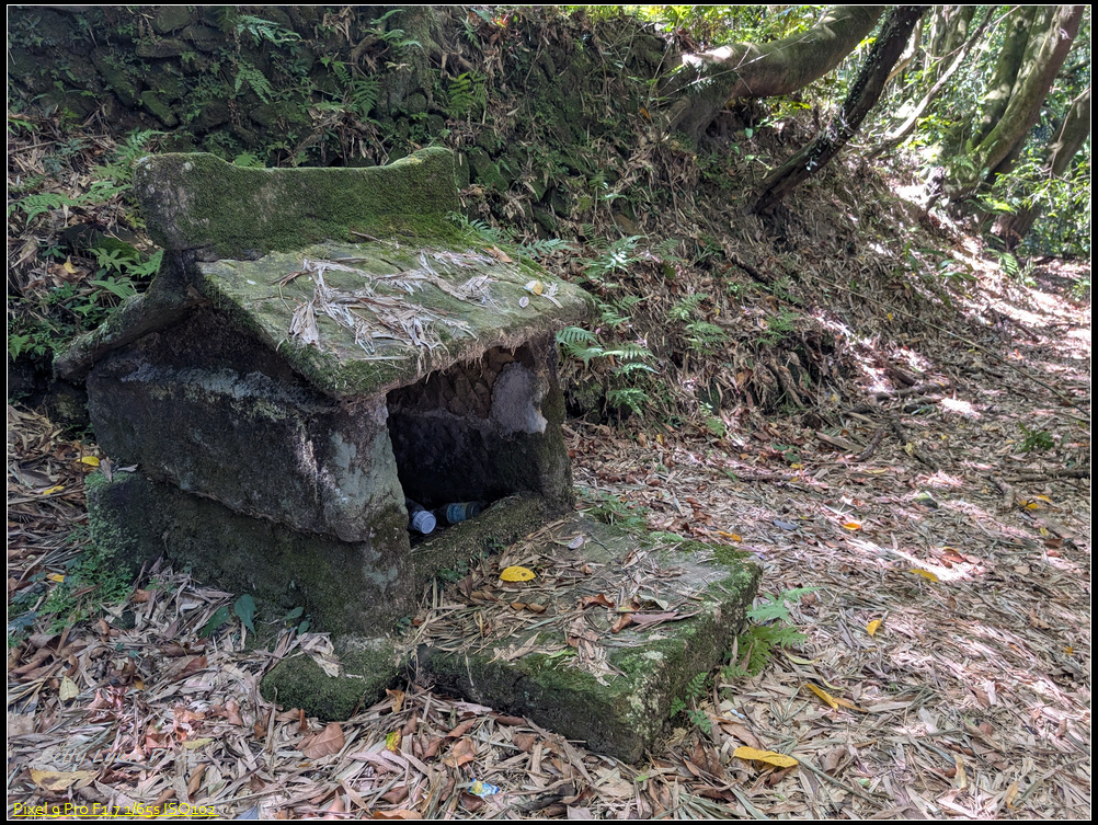 下切10分鐘就發現一座古老的土地公小廟, 石板造型相當小巧可愛, 不過土地公沒在裡面啊~ 大概是被搬走了…