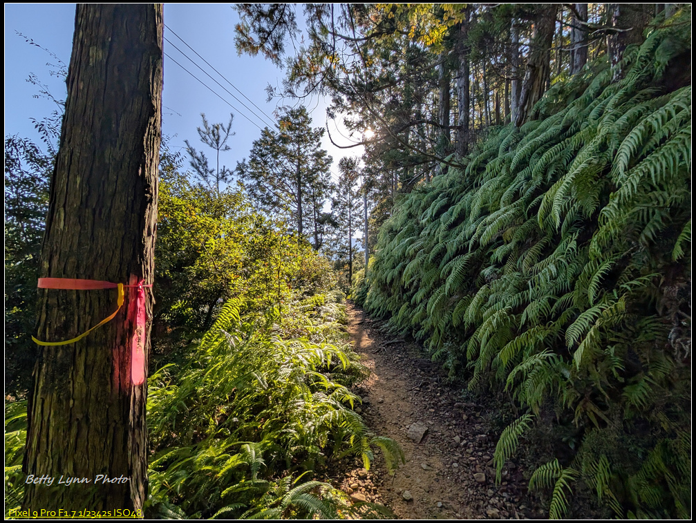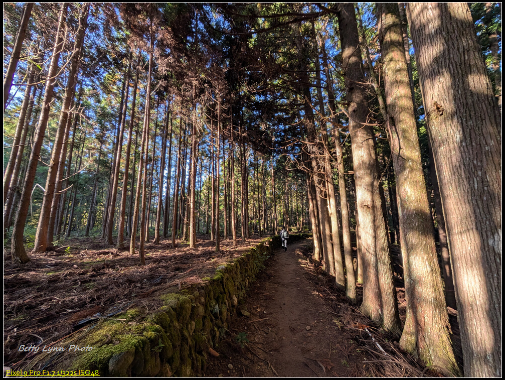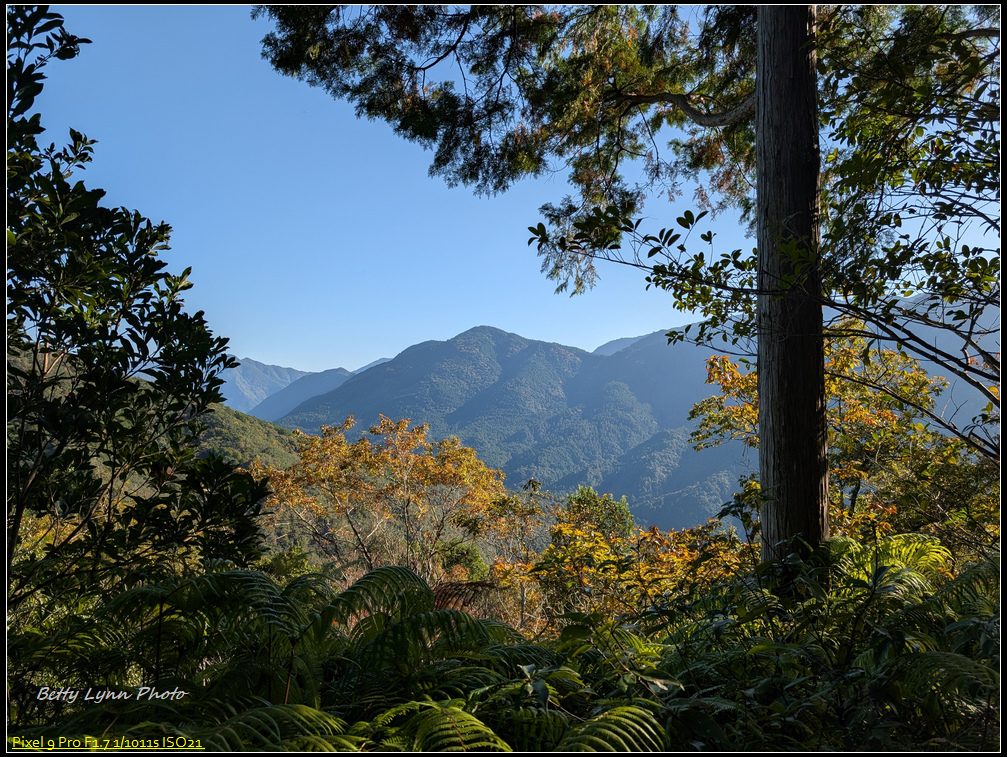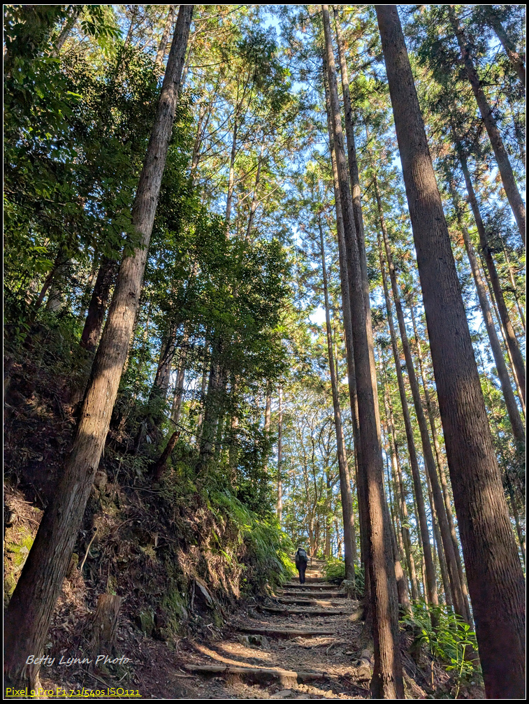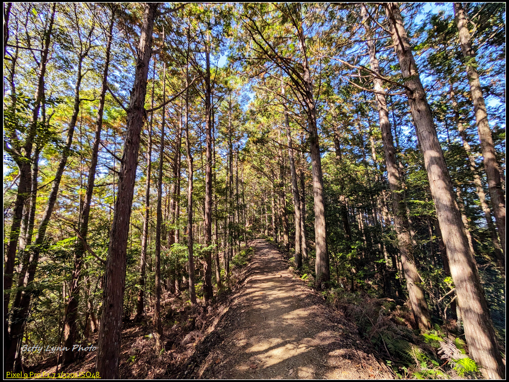 杉樹林中間突然出現空窗… 可惜這個窗口有點小, 還是繼續往上爬吧!