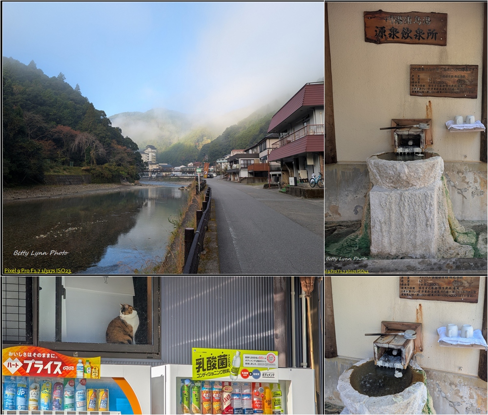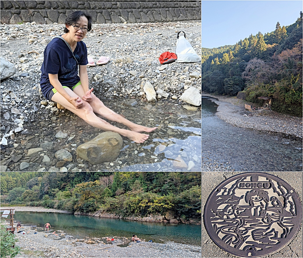 據說要泡到太陽下山前, 欣賞傍晚河上煙氣朦朧的樣子, 但11月中的傍晚就超冷, 我們只有勇氣泡腳, 不想全身濕濕的走在路上… 要泡溫泉可以回旅館泡
