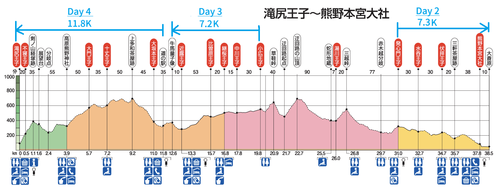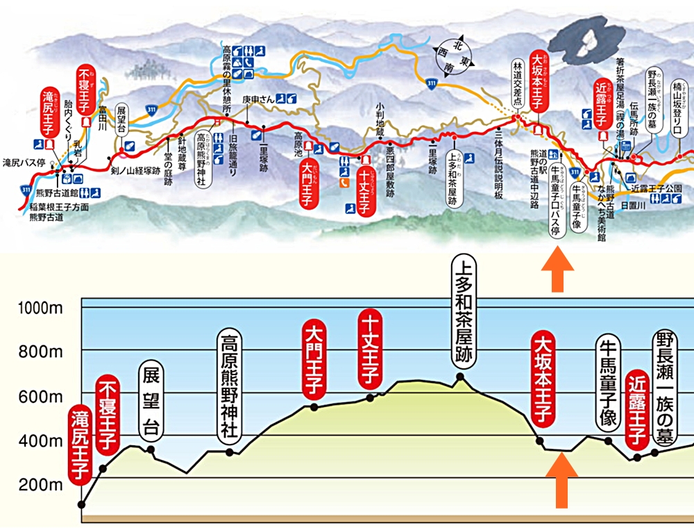 最高海拔:約310m(発心門王子) 最低海拔:約60m(大斎原)