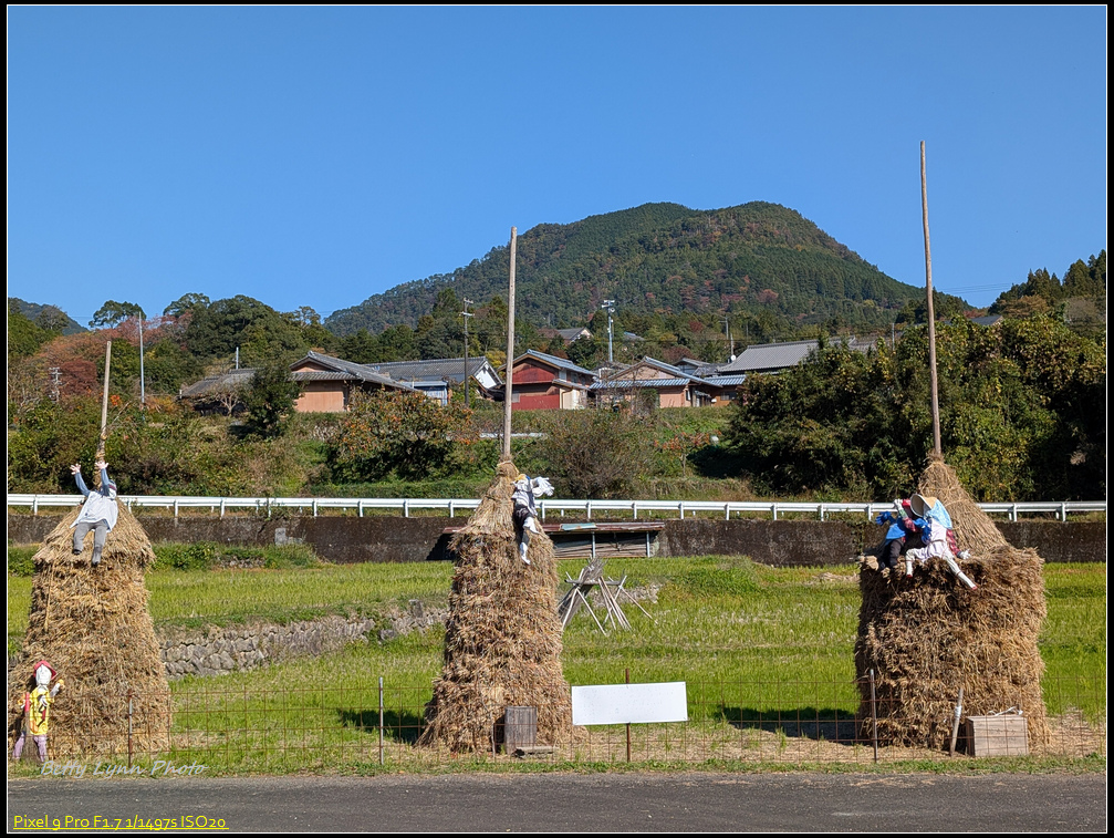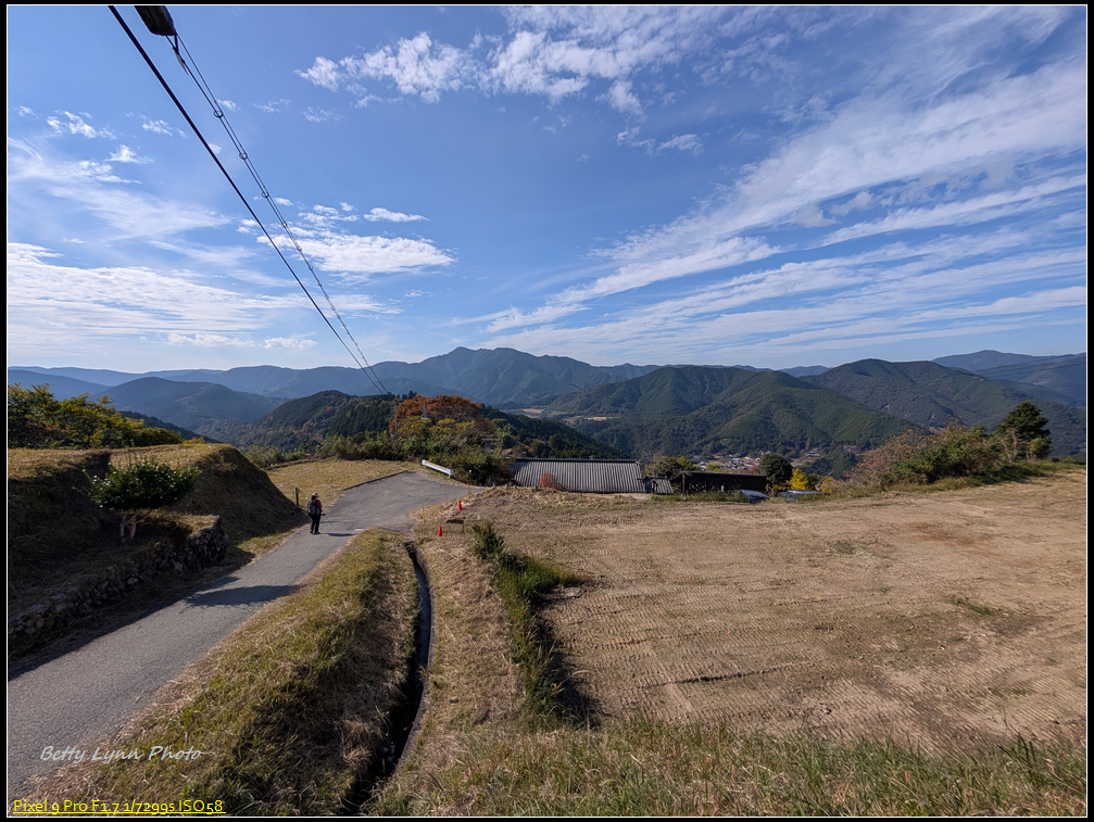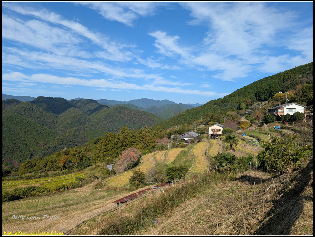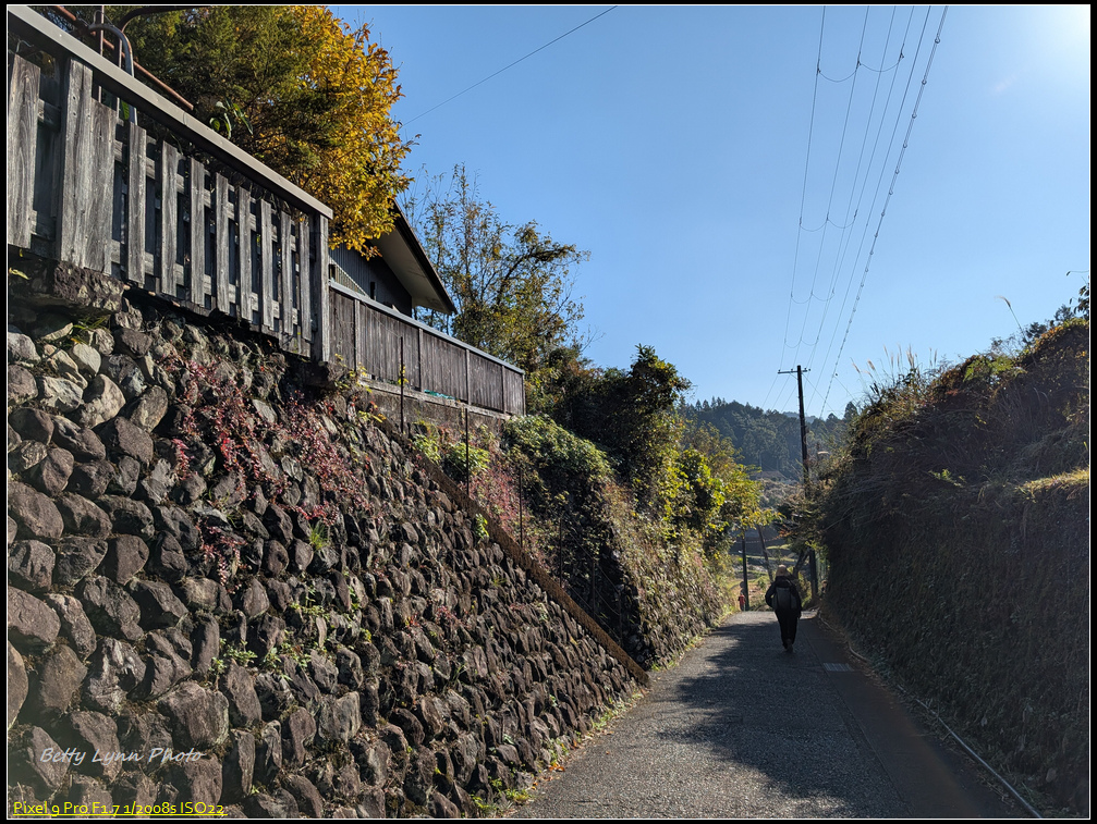 旁邊有一片梯田, 但現在已經秋收, 沒有可以反射天光的水田有點可惜, 黃色階梯看起來也很美