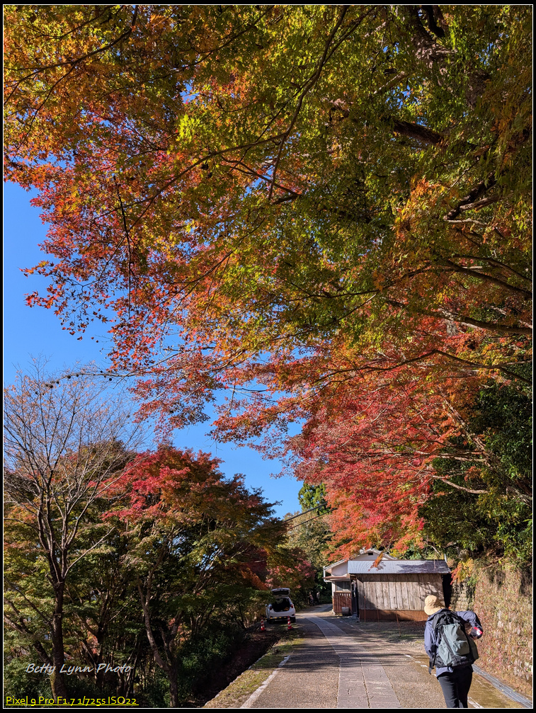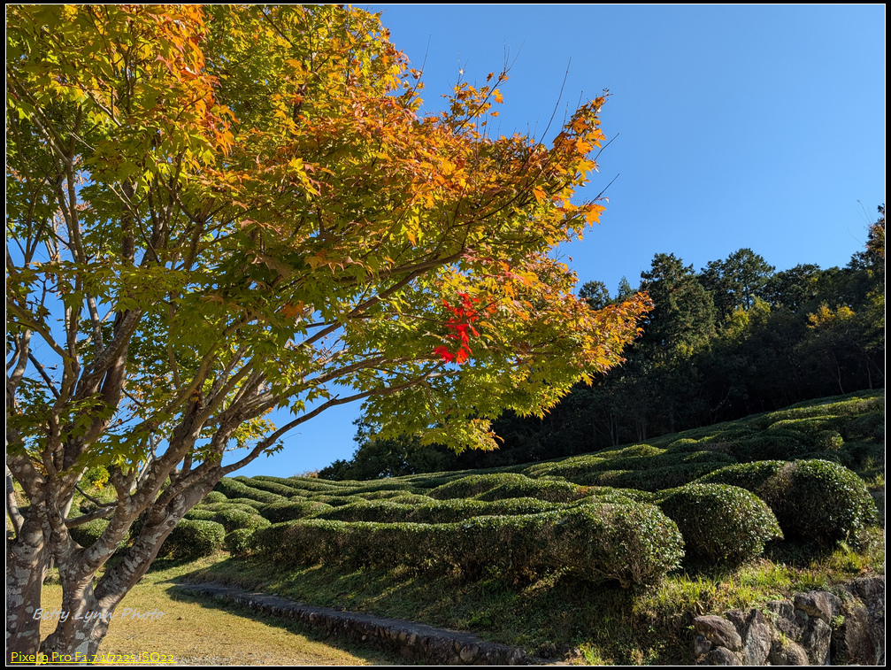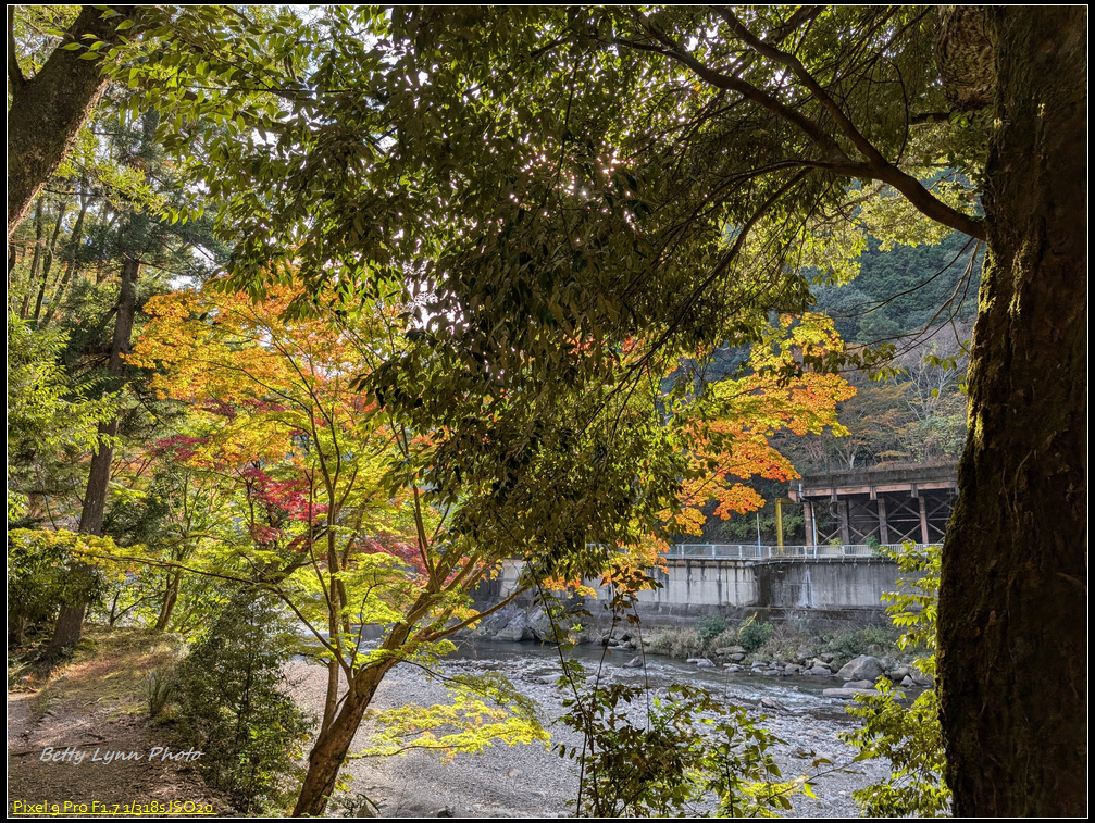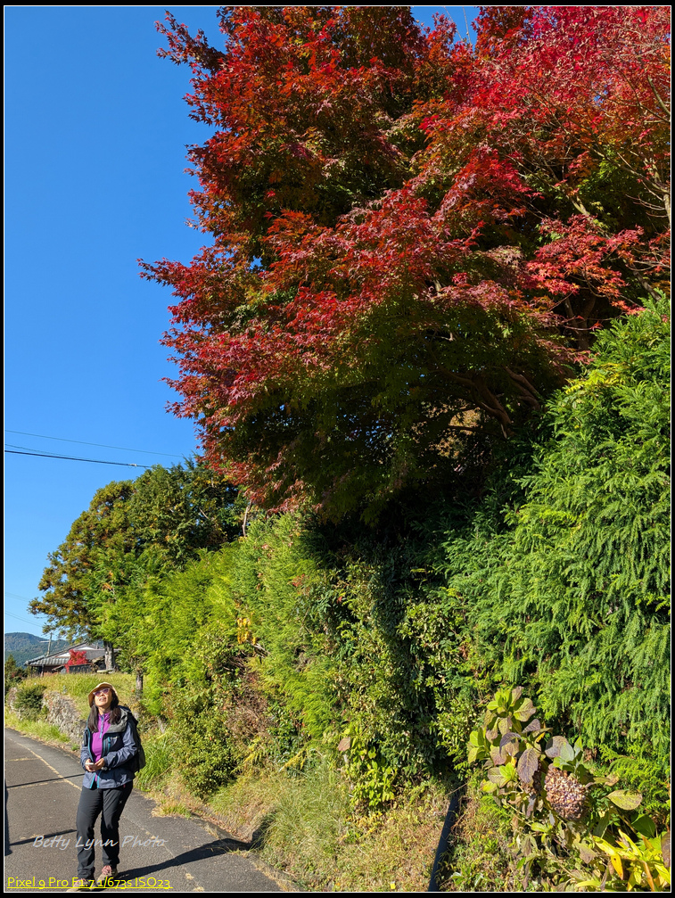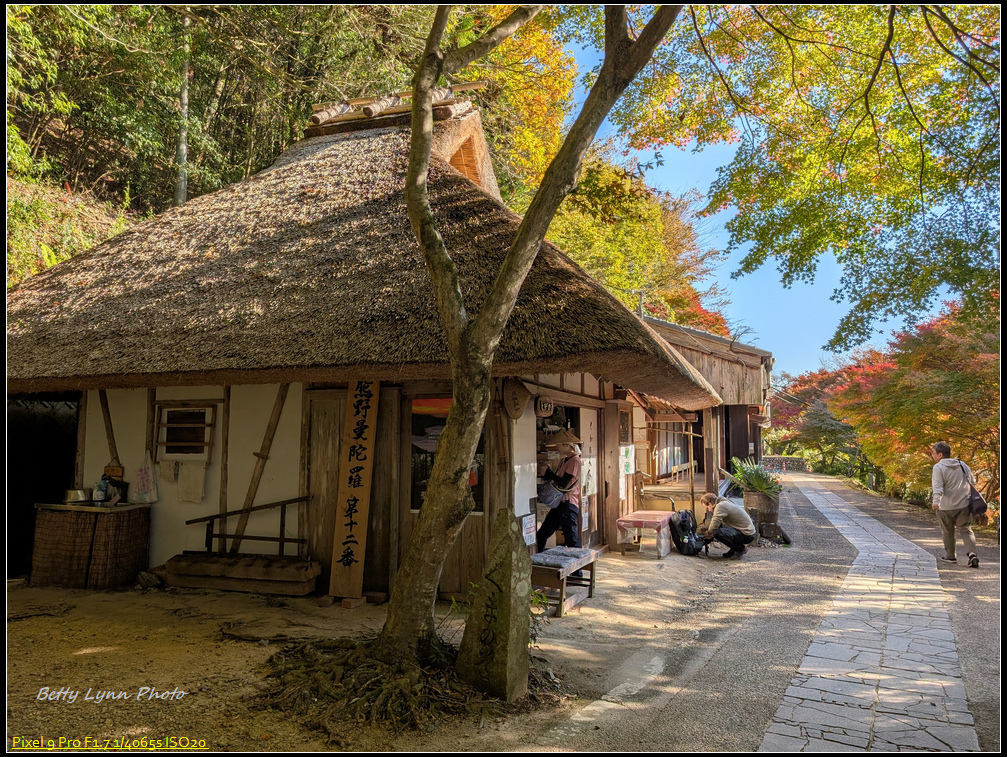 我看過網路上的照片真的是一片紅, 但我們來的時間早了幾天, 紅葉從前面一路燒過來, 但茶屋這裡就偏偏火候沒到位還差幾天, 現在只有微黃
