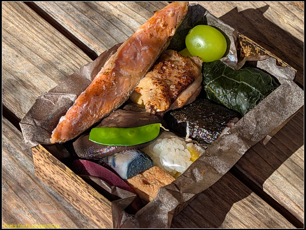 中午我們找了個好地方開箱溫泉旅館老闆給我們帶的便當… 超豪華! 三種不同的飯糰, 一大塊魚還有雞, 配菜也很豐富, 只是看到一片snow bean (荷蘭豆/豌豆), 還有一顆葡萄時, 有點不知該傻眼還是該笑啊~