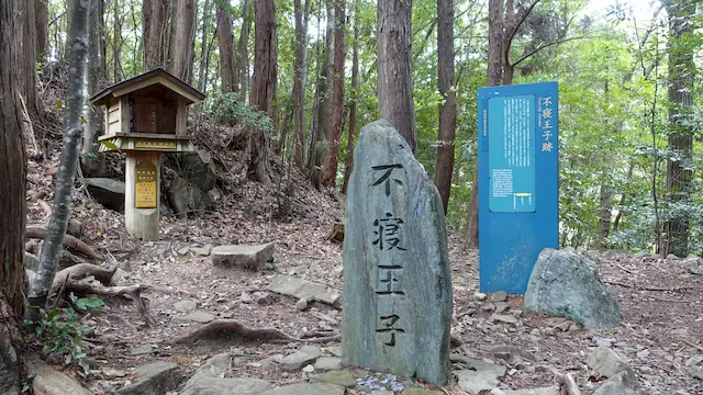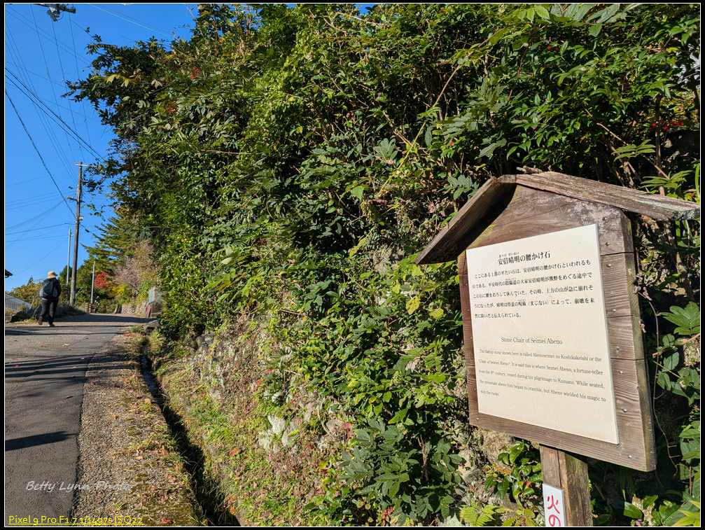 「安倍晴明の腰掛け石」 根據和歌山歷史傳說,陰陽師安倍晴明在沿著「中辺路」行進時,曾在這塊石頭上坐下休息,就在這時,上方的山體突然開始崩塌,晴明運用神通力阻止了崩塌。