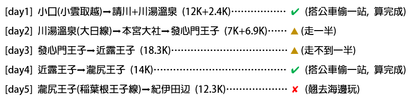 我們除了一開始的小雲取越有好好走完, 剩下的行程又被去頭截尾, 還走的斷斷續續, 執行度實在有待商榷, 但以行程的KPI而言, 押印蓋章有達成, 而且自我體感非常好!