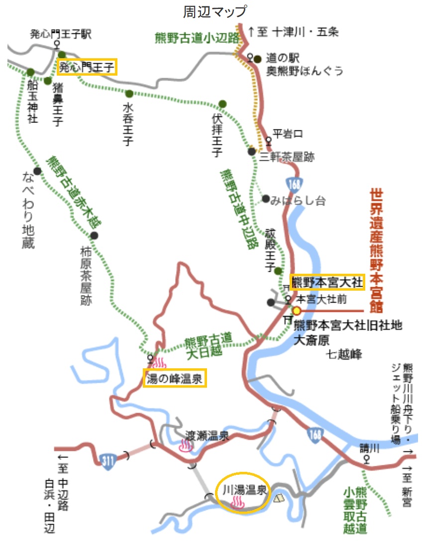 瀧尻王子:熊野九十九座王子神社中最重要的一座,曾是地位崇高的五體王子神社。這裡被視為進入熊野聖地的入口。朝聖者會在河中舉行淨身儀式,並在神社前進行供奉經文和表演村落神樂舞。