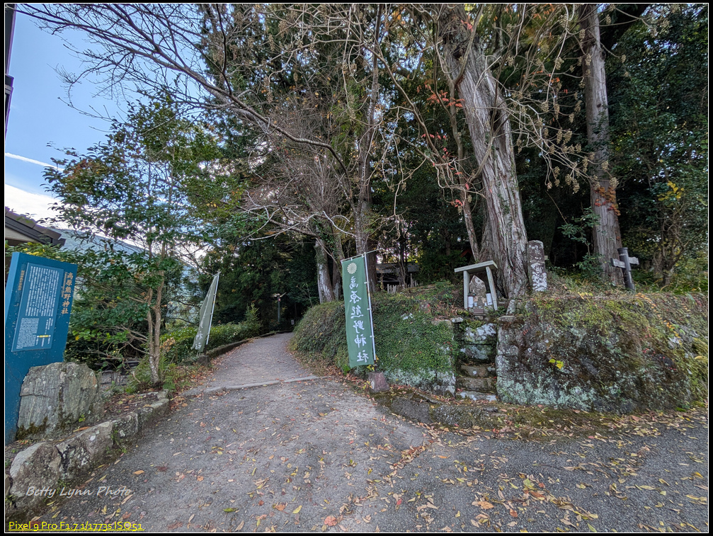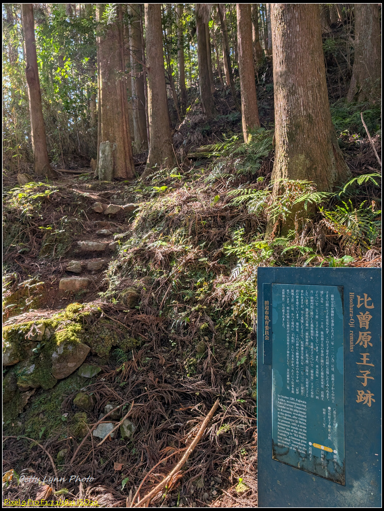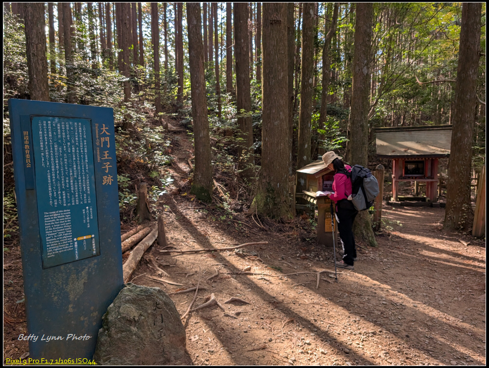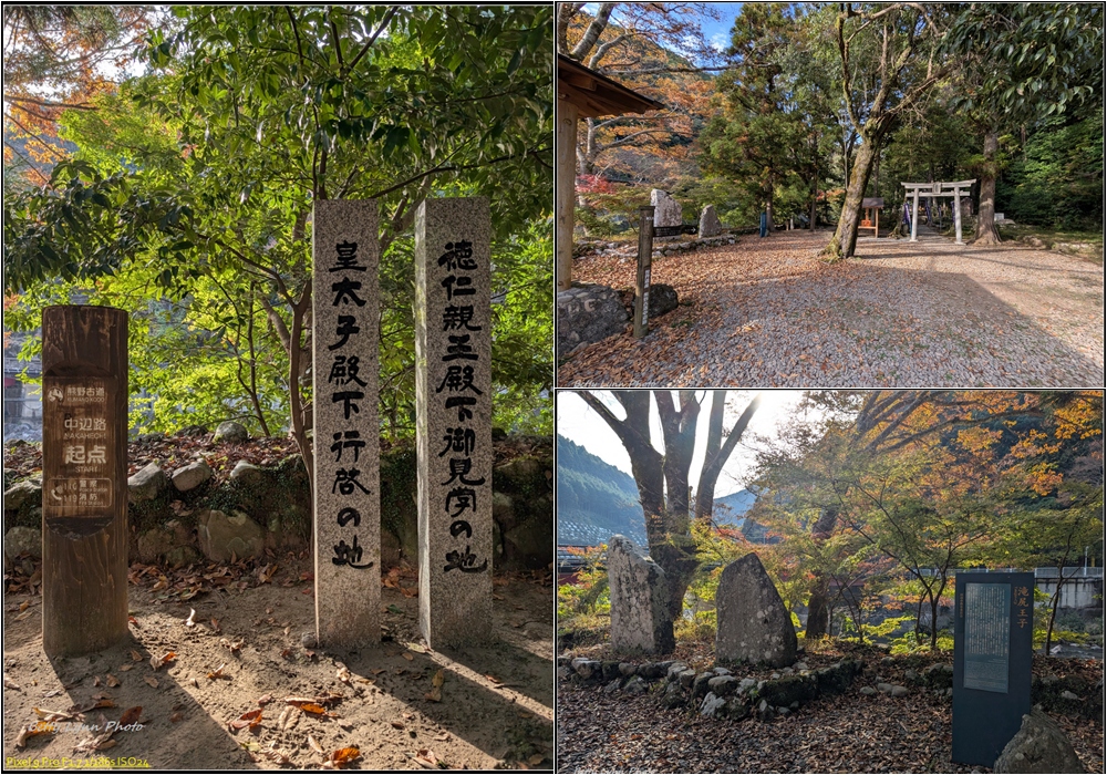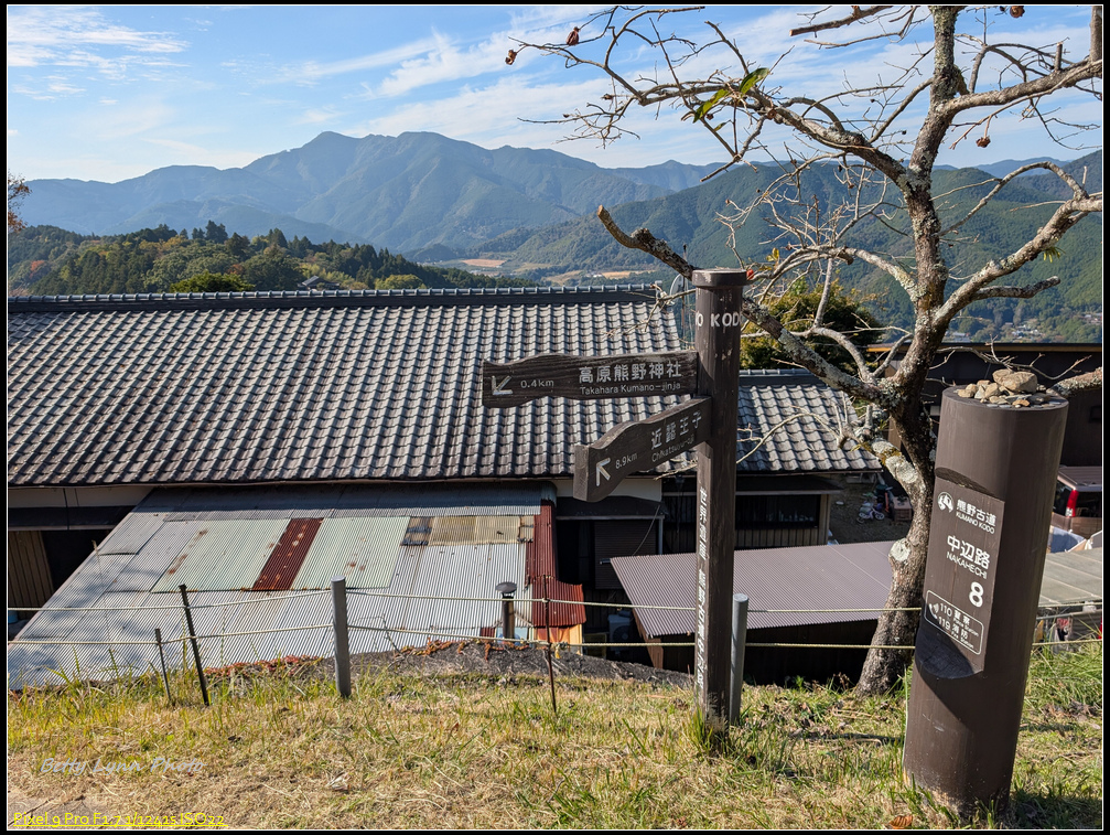 伏拝王子的小平台上有個「皇太子殿下行啓の地」的紀念木樁, 旁邊有眺望點, 我拍了眺望山脈的照片就閃了, 回來看資料才知道這裡可以遠望熊野本宮大社的舊社地(大斎原)& 大鳥居…