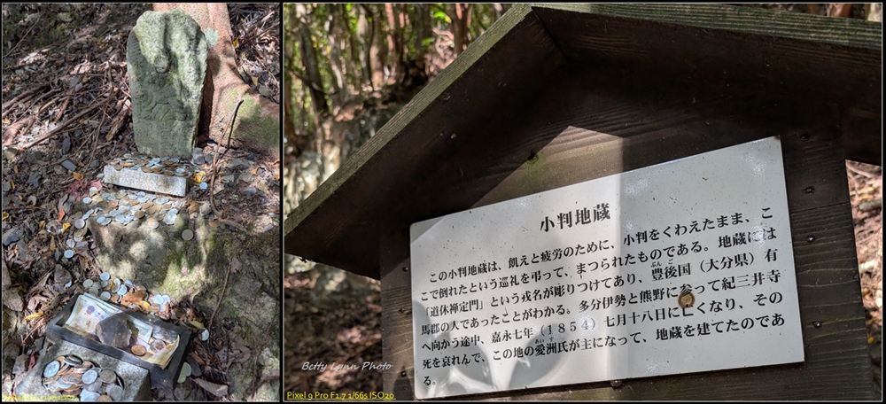 這座地藏像為紀念嘉永7年一位因飢寒交迫倒於此的朝聖者,人們發現他嘴裡含著一枚小判銅錢,不知是因為飢餓難耐,也可能是「如果我倒在路上,會給村民帶來麻煩。我希望死後至少能做些什麼。」過去的旅人別無選擇,只能依靠他人的善意