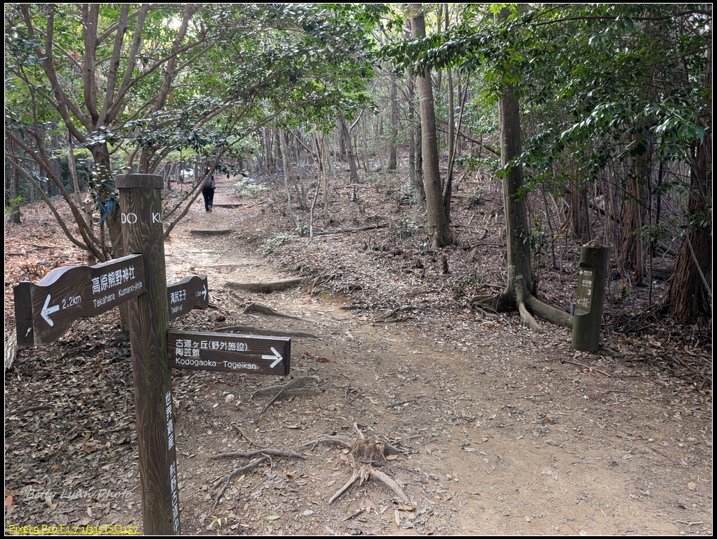 從”蘇生の森”的石碑再往本宮大社方向約15分鐘, 會碰到這個岔路, 通往一個景觀台「ちょっと寄り道展望台」(中文直翻類似”稍微繞一下路的展望台”), 上面可以眺望大斎原上的大鳥居…
